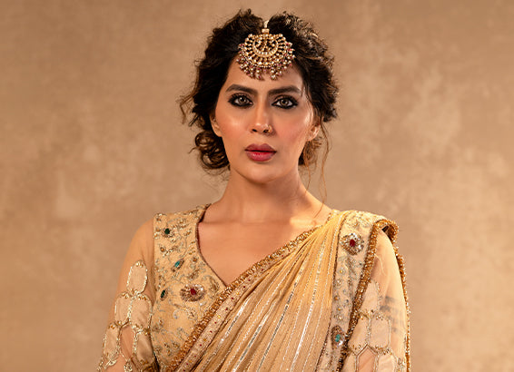 3D Embroidered Net Drape Saree with Gold Tissue Blouse