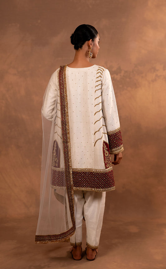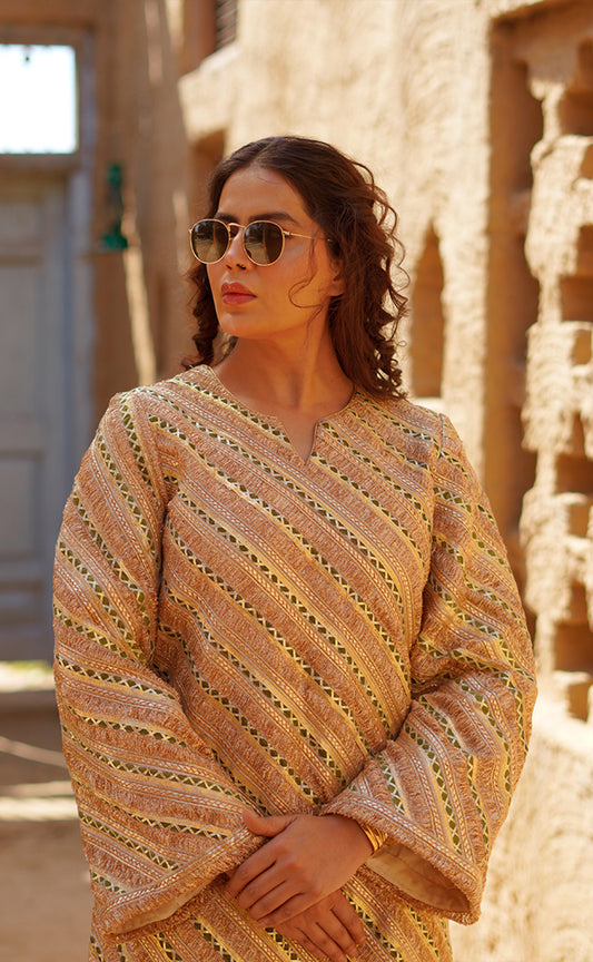Hand Embroidered Kaftan Cut Kurta Set with Brocade Pakistani Salwar