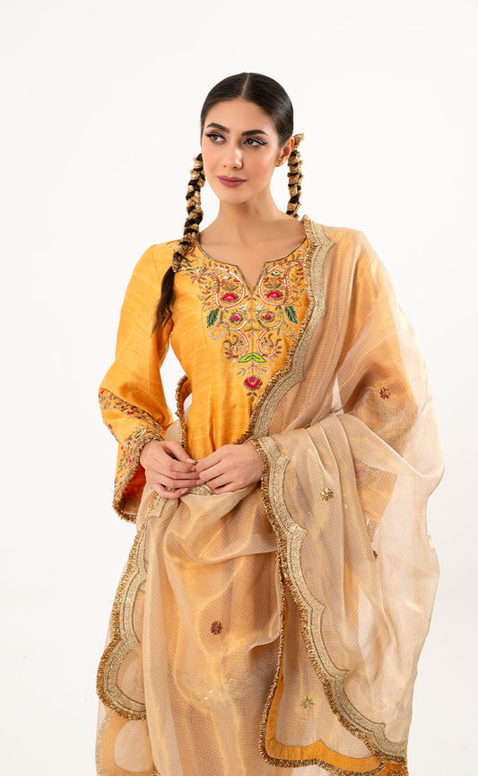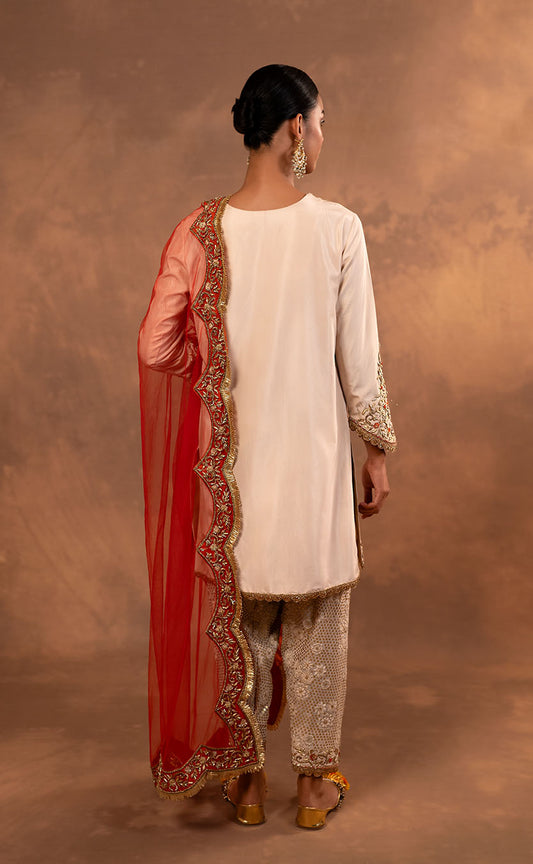 Hand Embroidered Straight Kurta Set with Pakistani Salwar and Orange Net Dupatta