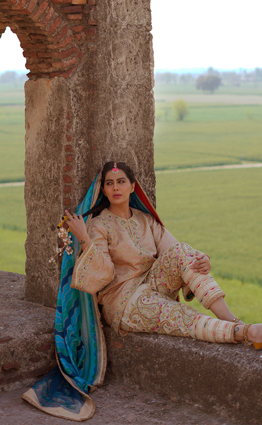 Hand Embroidered Straight Cut Kurta Set with Brocade Pakistani Salwar and Dupatta