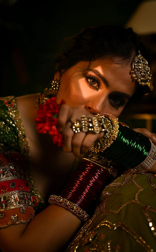 Hand Embroidered Lehenga Set with Bandhani Blouse and Double Dupatta
