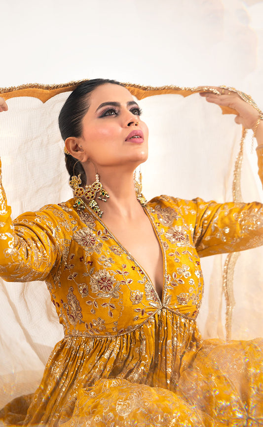 Silk Anarkali with Drape Dhoti Salwar and Aari Embroidered Dupatta