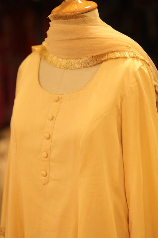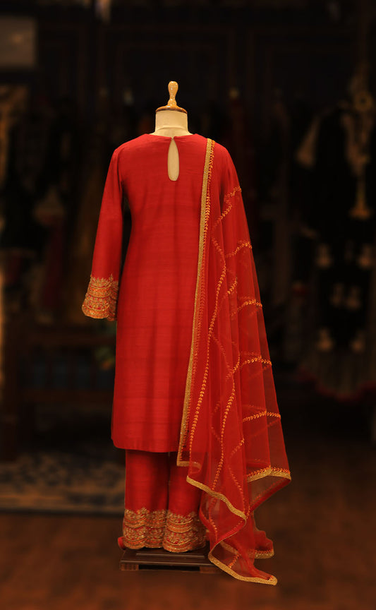 Hand Embroidered Long Kurta & Pants Set with Net Dupatta